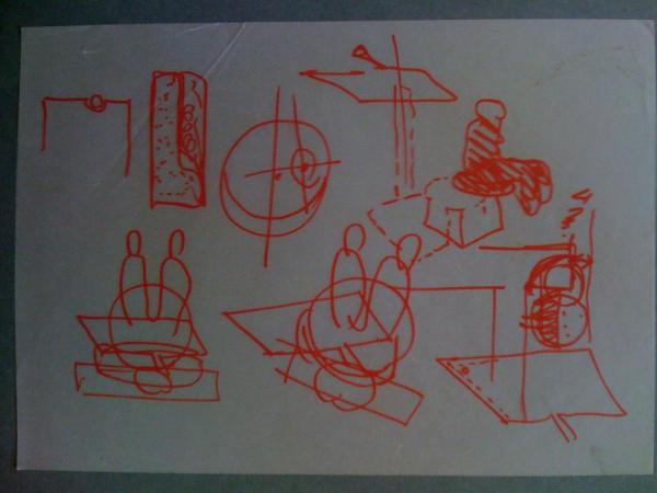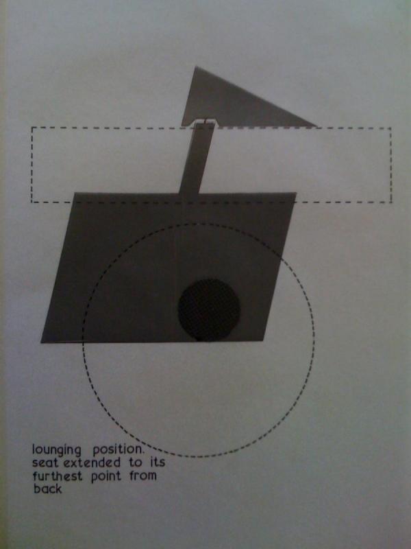 And here’s another motion study, a quick sketch in red pen.The two vignettes at lower left again show the chair in use from above. The idea being shown is that as the sitter shifts her weight from side to side, the seat beneath her (and the other elements of the chair) will move on a swivel joint.