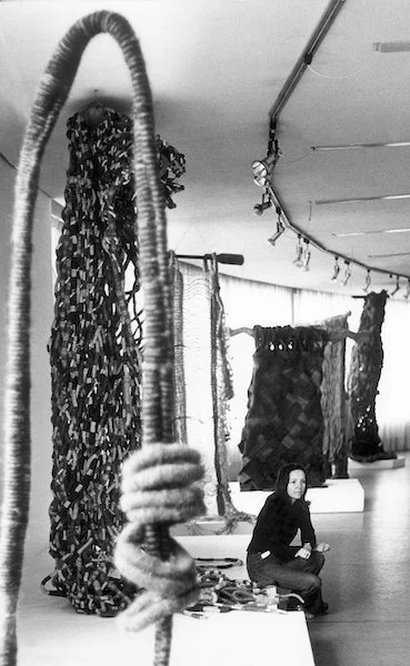 The interlaces positioned Amaral at the forefront of her medium, and she was soon exhibiting internationally. She was included in the 1967 Lausanne Biennial, Europe’s premier event for experimental tapestry, as well as the landmark 1969 exhibition “Wall Hangings,” organized at the Museum of Modern Art, New York, by curator Mildred Constantine and textile designer Jack Lenor Larsen. Smith gave Amaral a show at the Museum of Contemporary Crafts the following year, focusing on her “Woven Walls,” a series of densely crisscrossed works, some of which are curvaceous and embracing in their overall form. At the time, Amaral was also experimenting with plastic—a readily available material that she used to pack her work in the studio—rendering it ethereally translucent by layering it atop itself, as in works like Luz Blanca (White Light), 1969.