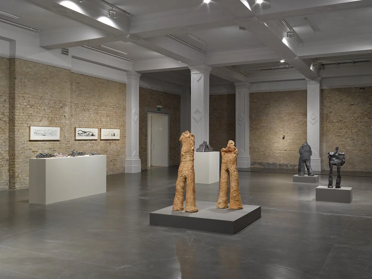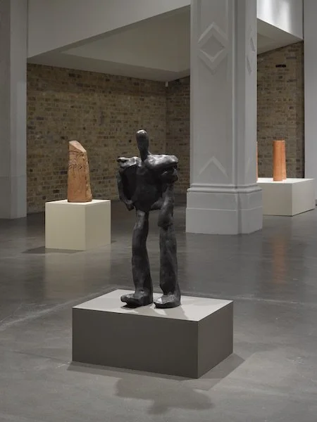 Five figures—each standing a little more than a meter high—dominate Simone Fattal’s current exhibition, “Finding a Way,” at the Whitechapel Gallery in London. One androgenous humanoid, cast in bronze, is titled The Master (1998). Despite its powerful name, it stoops slightly, as if pausing on a long journey, resigned to its fate. Its companions are made of heavy clay, headless, with legs like tree trunks. They are, as Whitechapel director Iwona Blazwick observes in the exhibition catalogue, “part human, part architecture,” suggesting “doors, arches and windows.” Think of them as portals, then, to Fattal’s way of seeing the world.