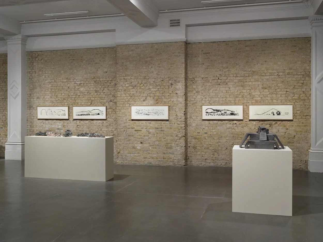 The exhibition includes other works too, almost all made since 2018. There are standing stelae and a small clay ziggurat on a boxlike pedestal, which contribute to the sense that one has come upon the remnants of some long-ago civilization. The walls are hung with wide-format etchings (“elongated papers,” in Fattal’s nice phrase) whose deft, semi-abstract marks are inspired by historic maps or her recollections of Barada River views. Another group of tabletop clay sculptures, the “Clouds,” mirror these horizontal compositions, coming across as the material traces of Fattal’s stray thoughts.