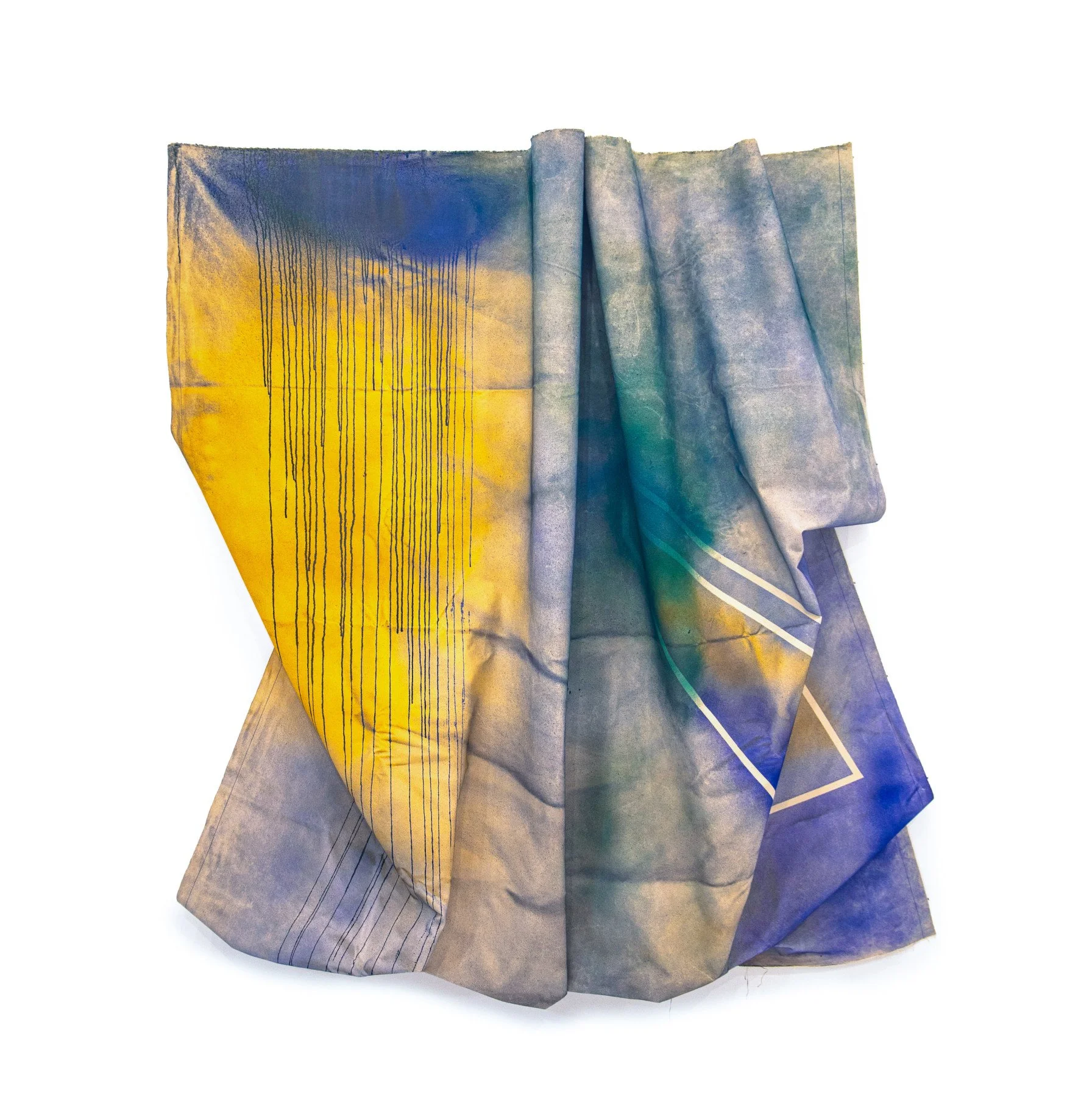 Another reason Yankowitz’s draped paintings have not become canonical—yet—is that she was too creatively restless to consolidate her achievement. Moving quickly through ideas, she first incorporated new features to her draped paintings that enhanced their affinity to structured garments, adding narrow pleats by running the canvases through a machine press, and subsequently introducing stitched lines, which cause the fabric to alternately pucker in and balloon out. (The stitching was done for her by professional sailmakers. “I don’t know how to sew,” she said wryly. “Let’s put that way.”) One work, Opened Flat (1971), has webbing straps crossing it horizontally, as if pinioning it to the wall. This makes explicit Yankowitz’s idea of “flattening an enclosure”—an inversion of the dynamics of representational painting, in which a flat surface is used to evoke 3D space.