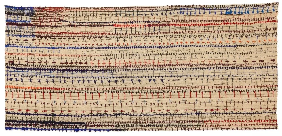 Dilated Grain Reading: Scanning Reds and Blues, 1973, extruded acrylic and flash paint on linen, 50 by 109 inches.